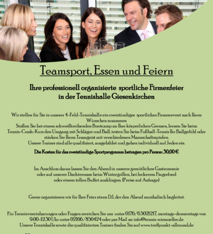 Nach einem 2-stündigen (auf Wunsch natürlich auch länger) Sportprogramm mit unseren qualifizierten Trainern in der Tennishalle genießen Sie leckeres Essen in unserer Gastronomie und verbringen einen geselligen Abend.